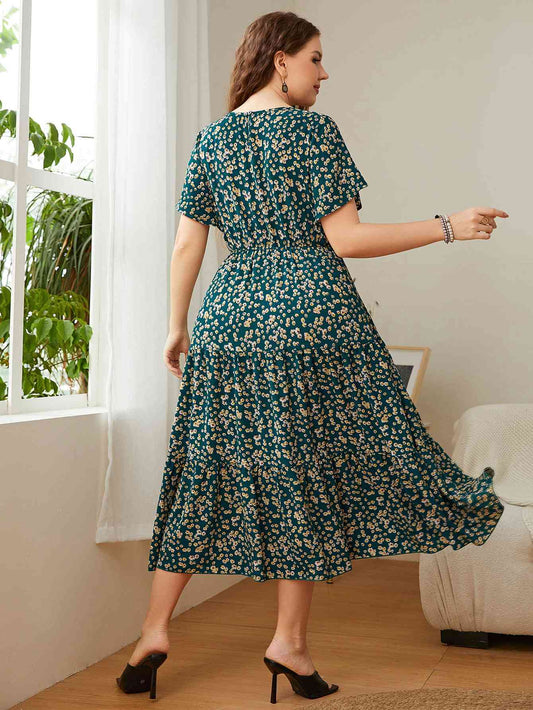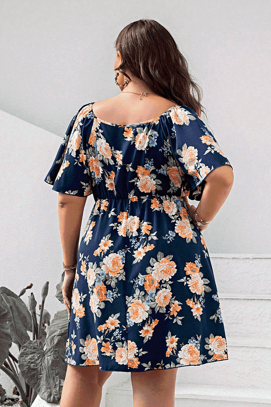 Plus Size Floral Print V-Neck Flutter Sleeve Mini Dress